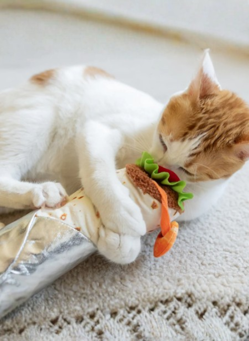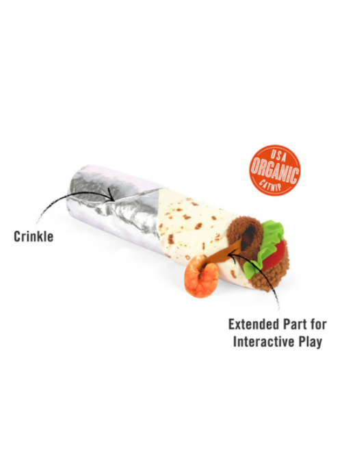 The Shrimp Purrito takes the fun up a notch with its amusing crinkly ingredients, engaging your feline friend in a delightful sensory experience. The highlight of this toy is the surprise interactive tuggable shrimp, providing additional entertainment for your kitty's play sessions.