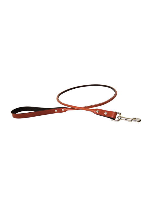 Our Rolled Leather Leash has it all. Auburn Leathercrafters’ Rolled Leather Leash is a wonderful match to our Rolled, sometimes called Round, Leather Collars but looks great with many other varieties, as well. The flat handle is smooth and comfortable and becomes more supple with age. Like our Round Collars, the edges are beveled and hand polished before applying edge finish resulting in an extraordinarily comfortable feel. Constructed of fine quality top grain leather and assembled with a solid nickel-plated swivel bolt snap and smooth capped rivets.