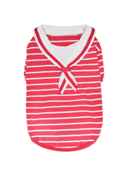 Crafted from 100% premium cotton, it delivers a soft, breathable fit that keeps your dog comfy all day long. The standout feature is the classic sailor collar—white with a crisp edge and a playful knot that ties at the neck for a timeless, maritime look. The striped fabric adds a touch of nautical flair, while the relaxed curved hem provides unrestricted movement for joyous zoomies and gentle strolls alike.