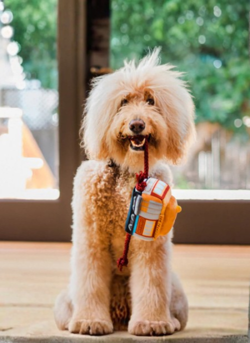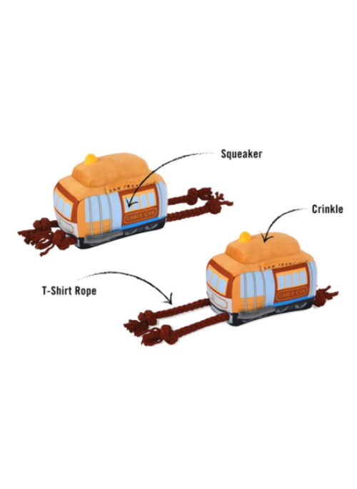 Ding ding! Next stop: playtime! Inspired by our home city of San Francisco, P.L.A.Y.'s Canine Commute San Pup-cisco Cable Car brings Bay Area charm straight to your pup’s toy collection. With interactive t-shirt rope tracks that pull back and forth and a squeaker in the body, this plush toy is perfect for pups who love a little tugging action along with their playtime. Hop on for a ride to endless fun!