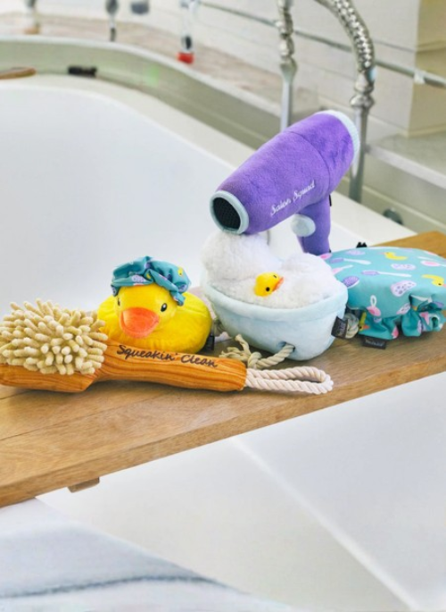 Play, rinse and repeat with P.L.A.Y.’s Splish Splash Collection! Bath time is always better with a buddy, so grab Bubbles the Duck and the matching shower cap before your pup dives into the tub toy. Be sure to scrub-a-dub-dub extra well with the shower brush before fluffing their fur with the hair dryer!