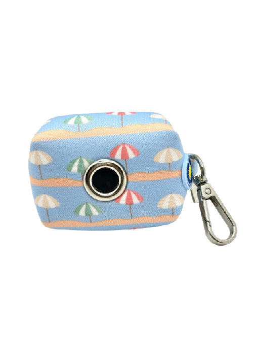 Keep your dog walks tidy with the Sunshade Waste Bag Holder! This super cute accessory attaches right to your leash, so you'll always have waste bags on hand. The design features an exclusive watercolor print of beach umbrellas in shades of pink, green, and blue - perfect for adding a little seaside style to your strolls. No more fumbling around for bags, just clip this holder on and you're good to go.