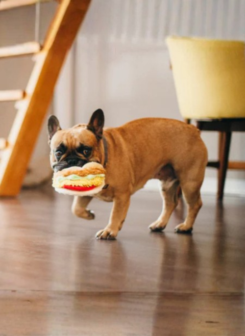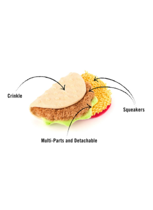 Spice up playtime with the P.L.A.Y.’s Tail Waggin' Taco toy. This fiesta of fun features detachable parts—a crinkly shell that comes off, and squeaky meat and cheese that completely come apart. Perfect for dogs who love to taco ‘bout dismantling their toys, this toy offers endless hours of crinkling and squeaking fun. It’s nacho ordinary toy, and it’s sure to be a favorite at every playtime!