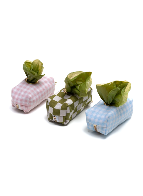 Clips onto the O ring of leashes, and holds one standard roll of waste bags. Bags dispense from the eyelet on the bottom.