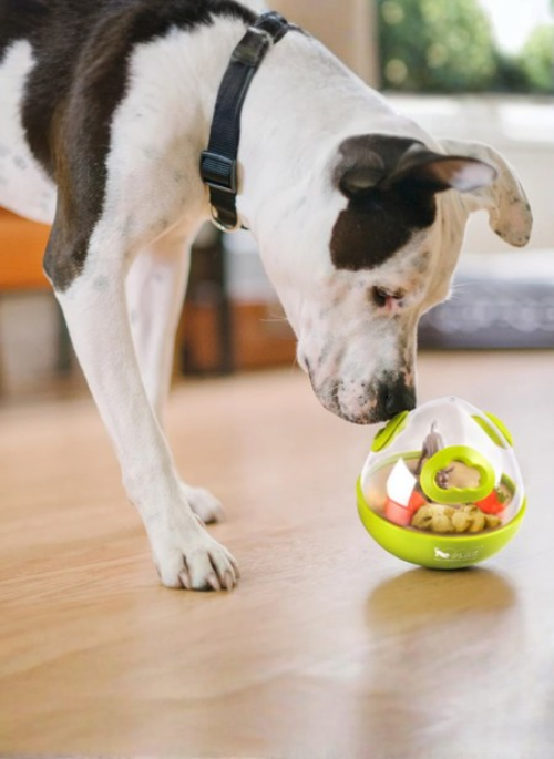 Your pup loves to play, and there is nothing more exciting than when treats are part of the equation! P.L.A.Y.’s Wobble Ball™ dog toy combines play time and mental stimulation to create the ultimate enrichment toy by enticing your pup’s senses. Coupled with the sound and sight of dog treats spinning inside, this interactive puzzle toy is uniquely shaped to roll around unpredictably to your fluffy friend’s delight. Simply insert your dog’s favorite treats or kibble and watch as he or she stays both mentally and physically stimulated while trying to get their paws on these tasty rewards. Your dog is sure to love this treat dispensing toy!