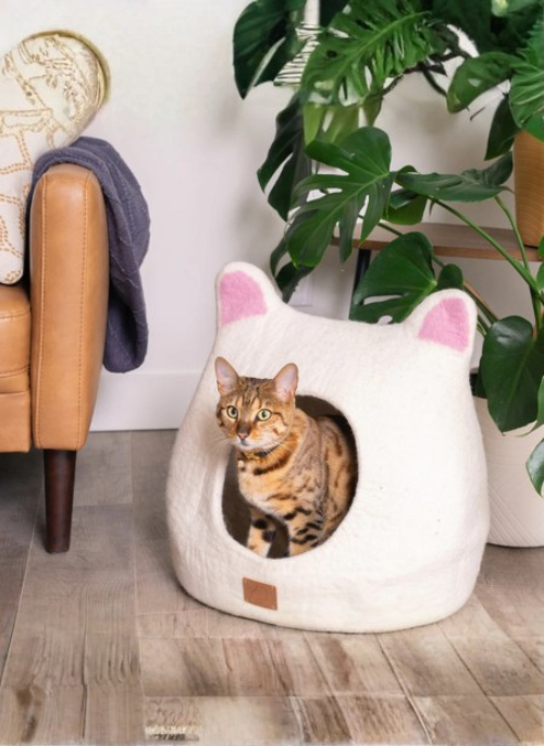 This adorable cat cave is the perfect blend of functional design and cozy comfort. Handcrafted from premium 100% organic New Zealand felted wool, this Cat Ears Felt Wool Cat Cave keeps your cat or kitten protected while offering a peekaboo opening that allows them to stay engaged with their surroundings. Its adorable design complements any home décor, encapsulating a warmth that appeals to both cats and their owners.