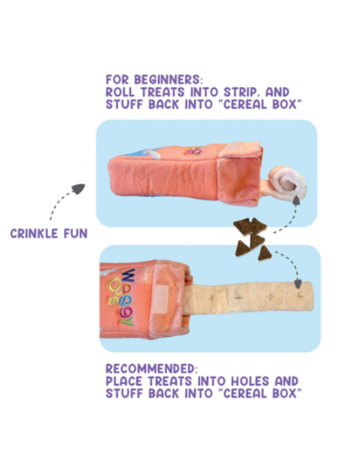 This plush cereal box contains a full strip of nosework pockets to hide treats inside. Place treats in the pocket holes or roll them into the strip to stuff back into the box, and watch your dog engage their senses to seek them out! This toy features crinkle noise paper and our signature fouguard lining for extra durability. To maintain the longevity of this toy, we recommend removing it after all the treats have been foraged.